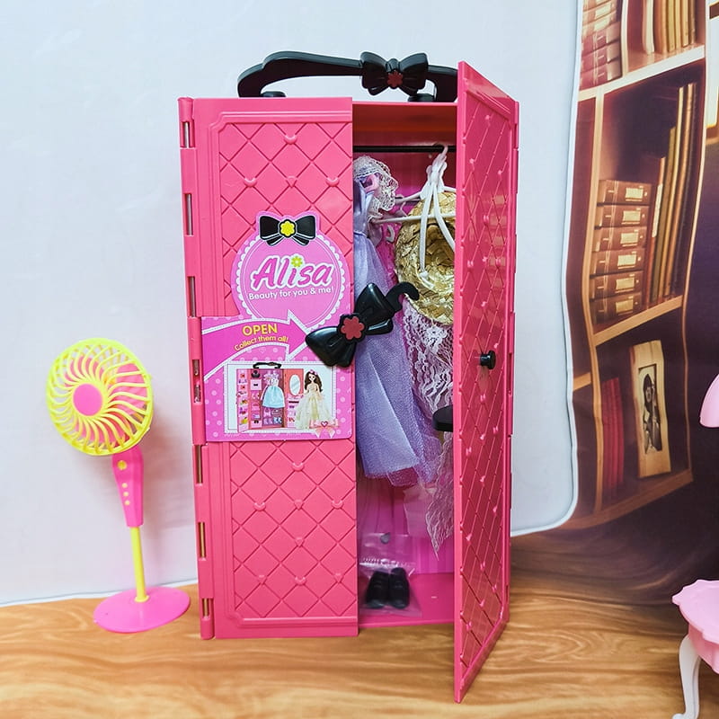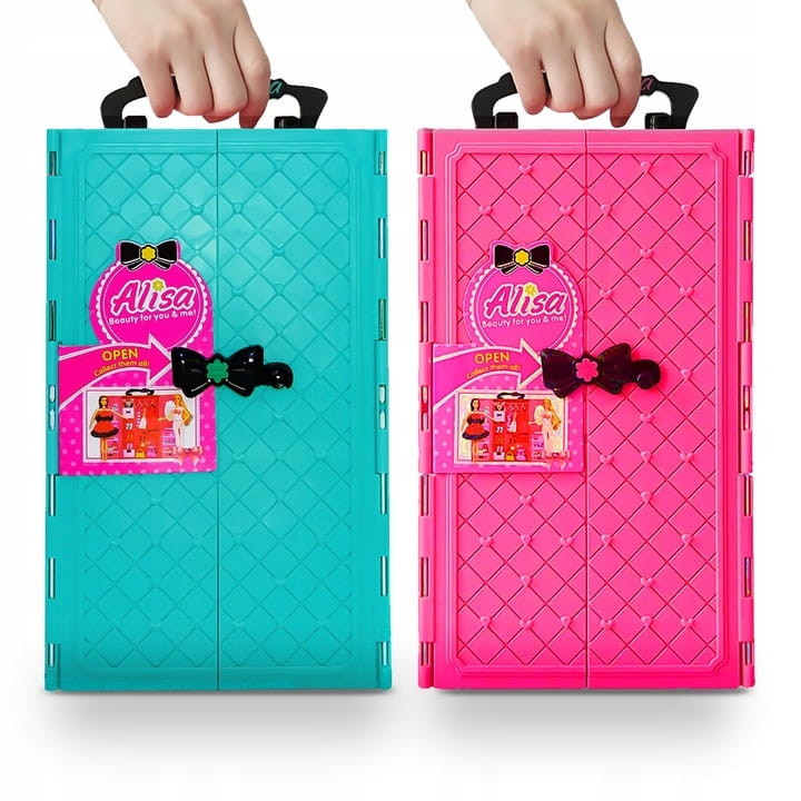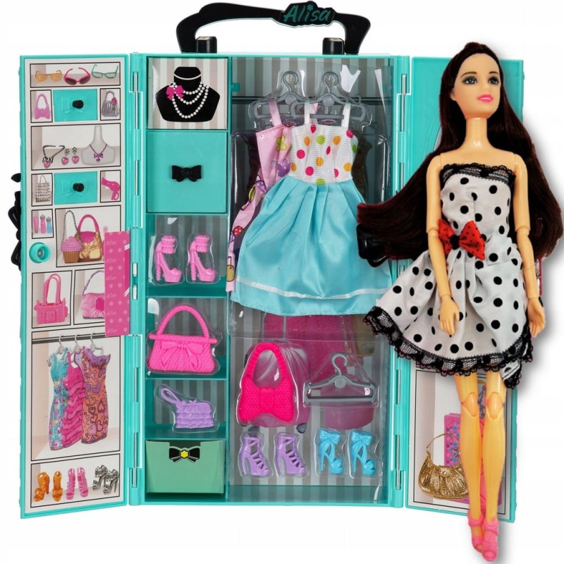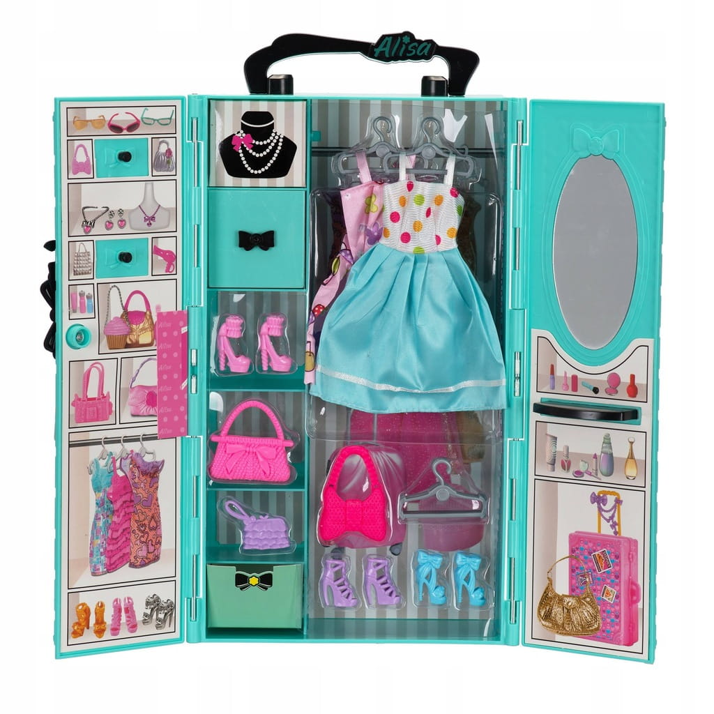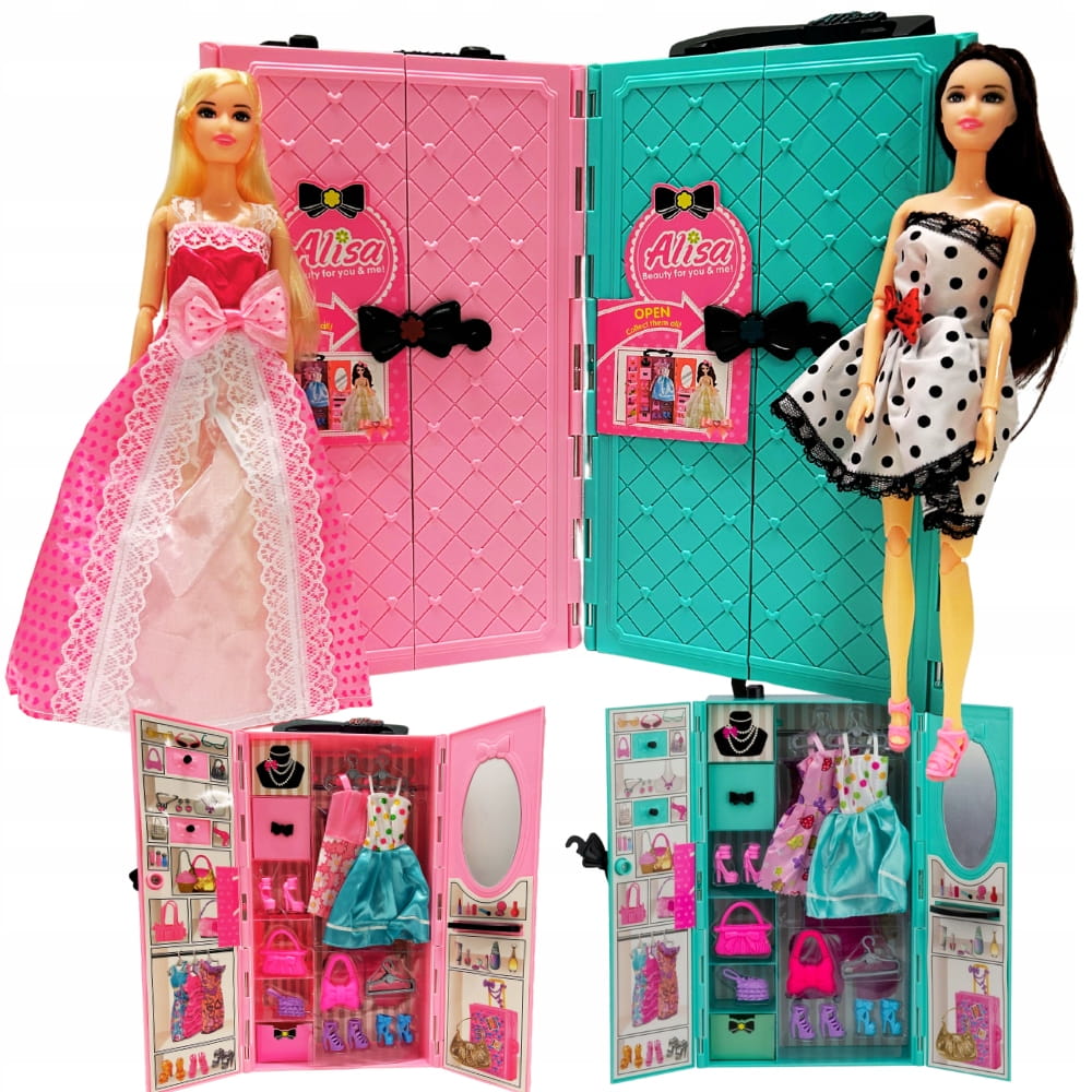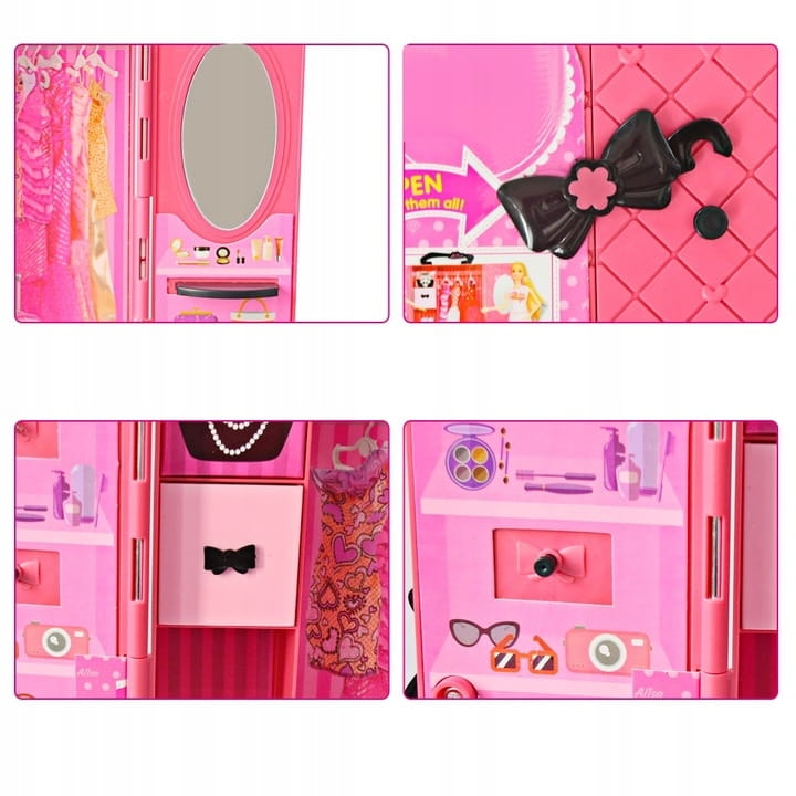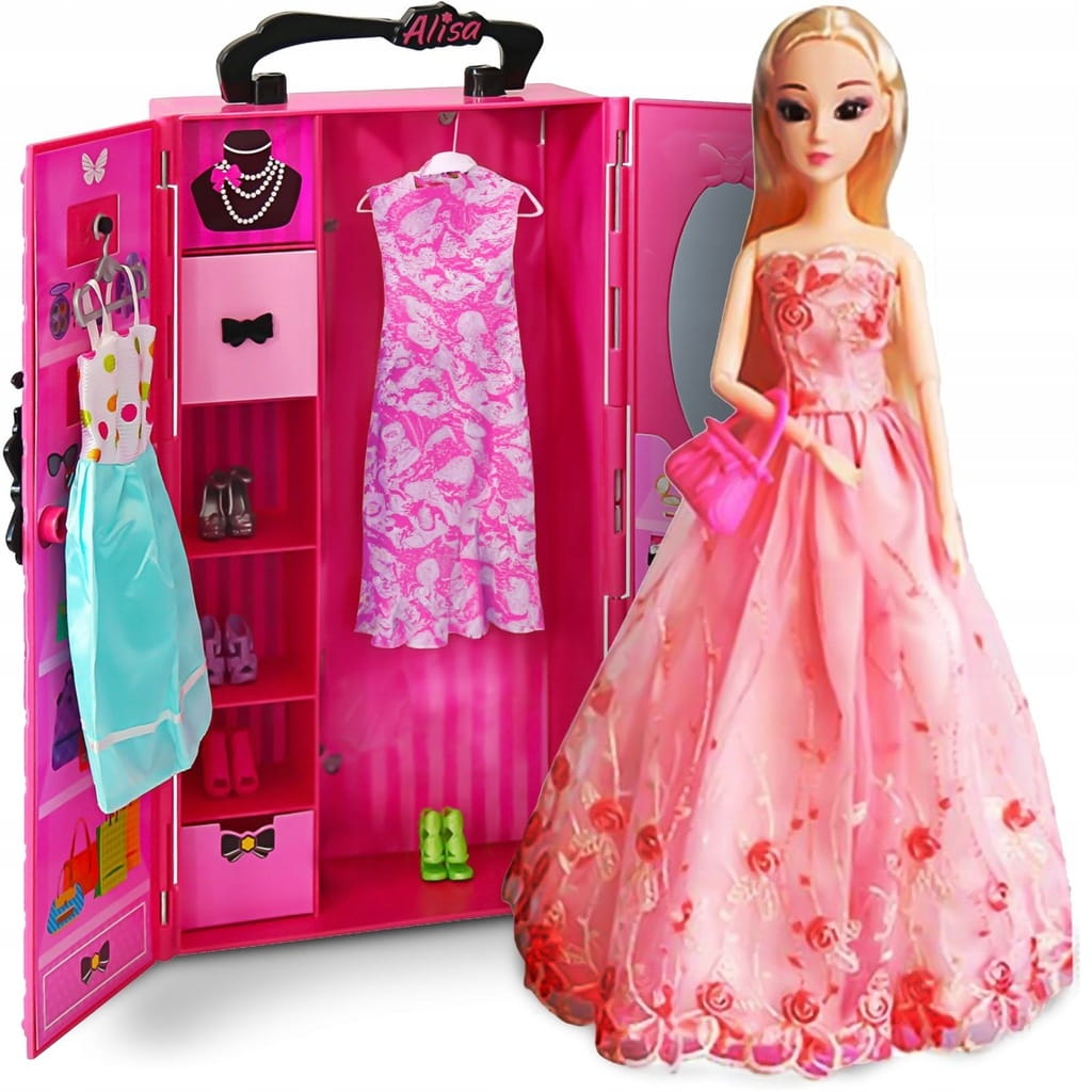 - 3 sukienki (dwie w szafce, jedna na laleczce)