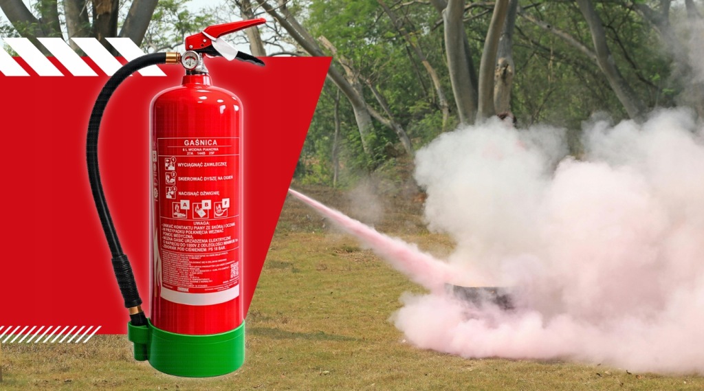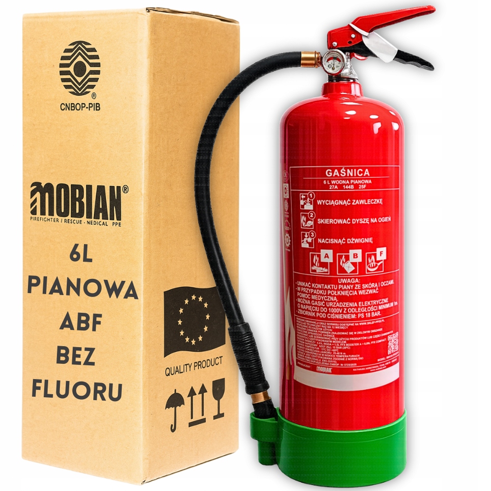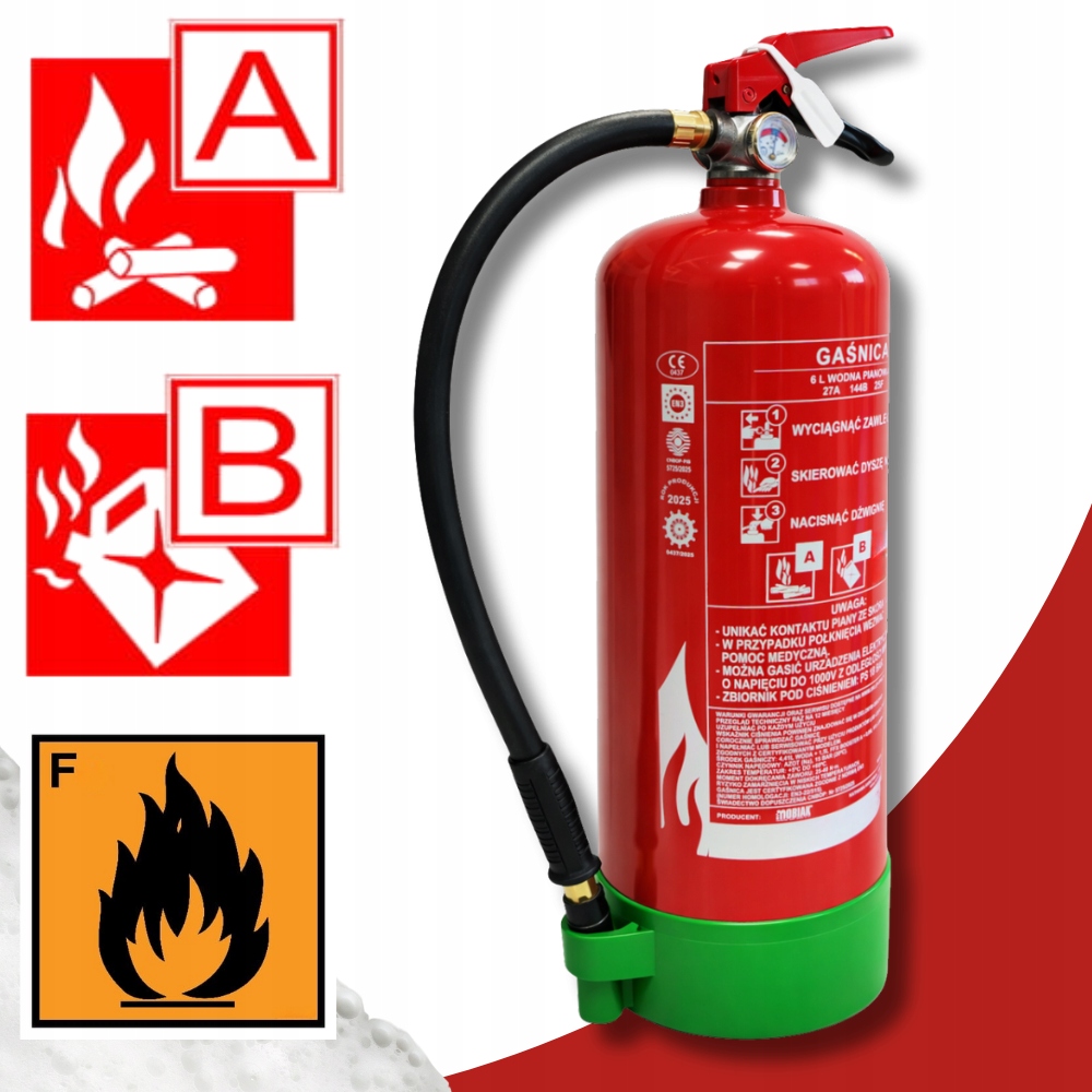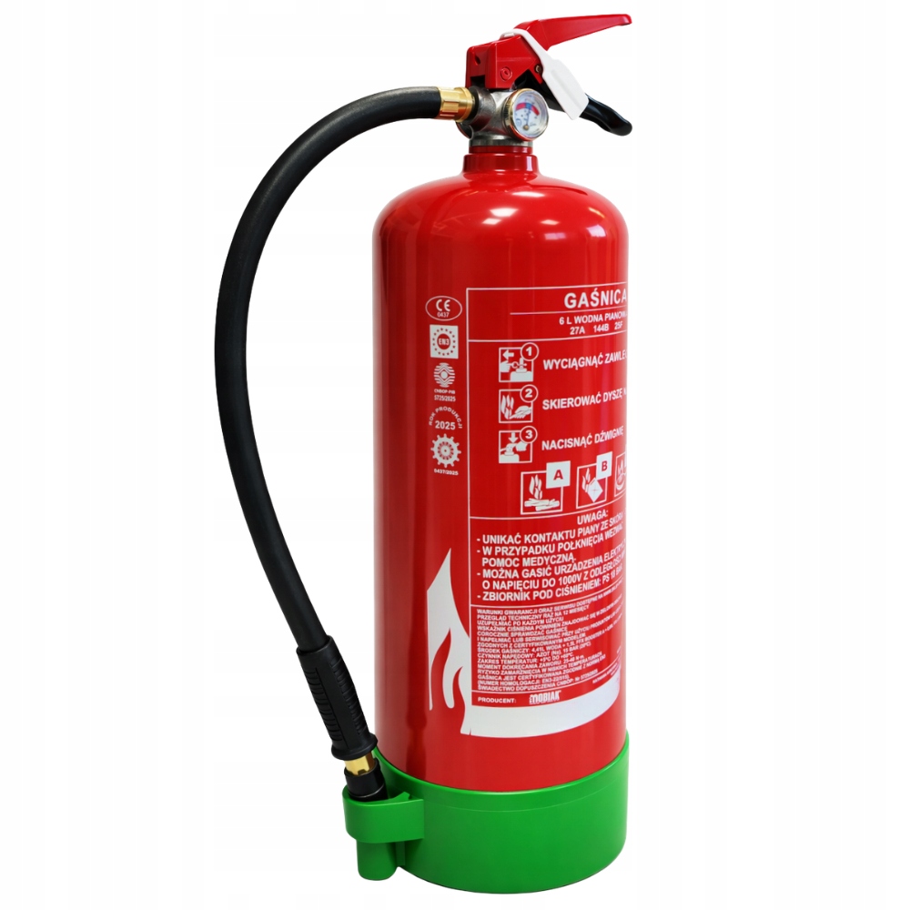 ► Gaśnica 6L pianowa ► Rok produkcji 2026 ► Uchwyt do mocowania na ścianie ► Certyfikaty: CE, BSI, CNBOP, EN3, MED, MPA