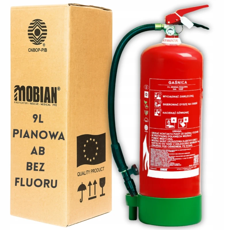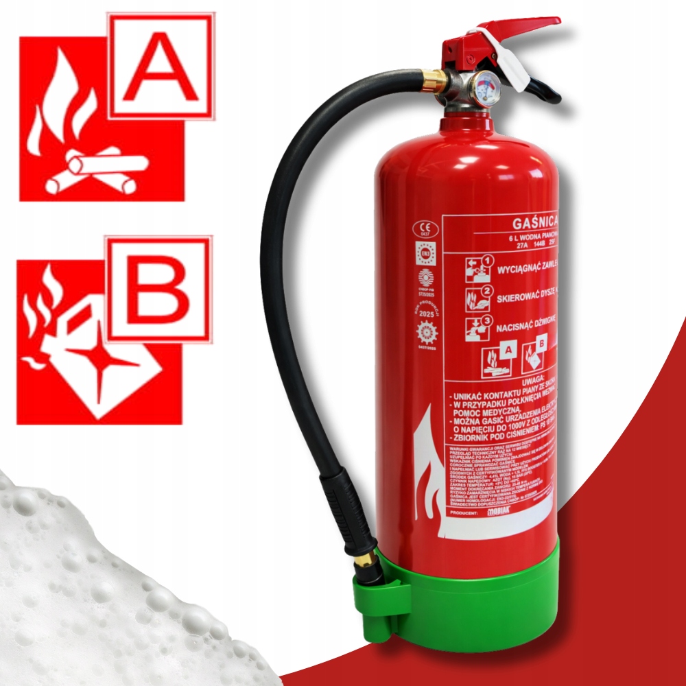 ► Gaśnica 9L pianowa ► Rok produkcji 2026 ► Uchwyt do mocowania na ścianie ► Certyfikaty: CE, BSI, CNBOP, EN3, MED, MPA