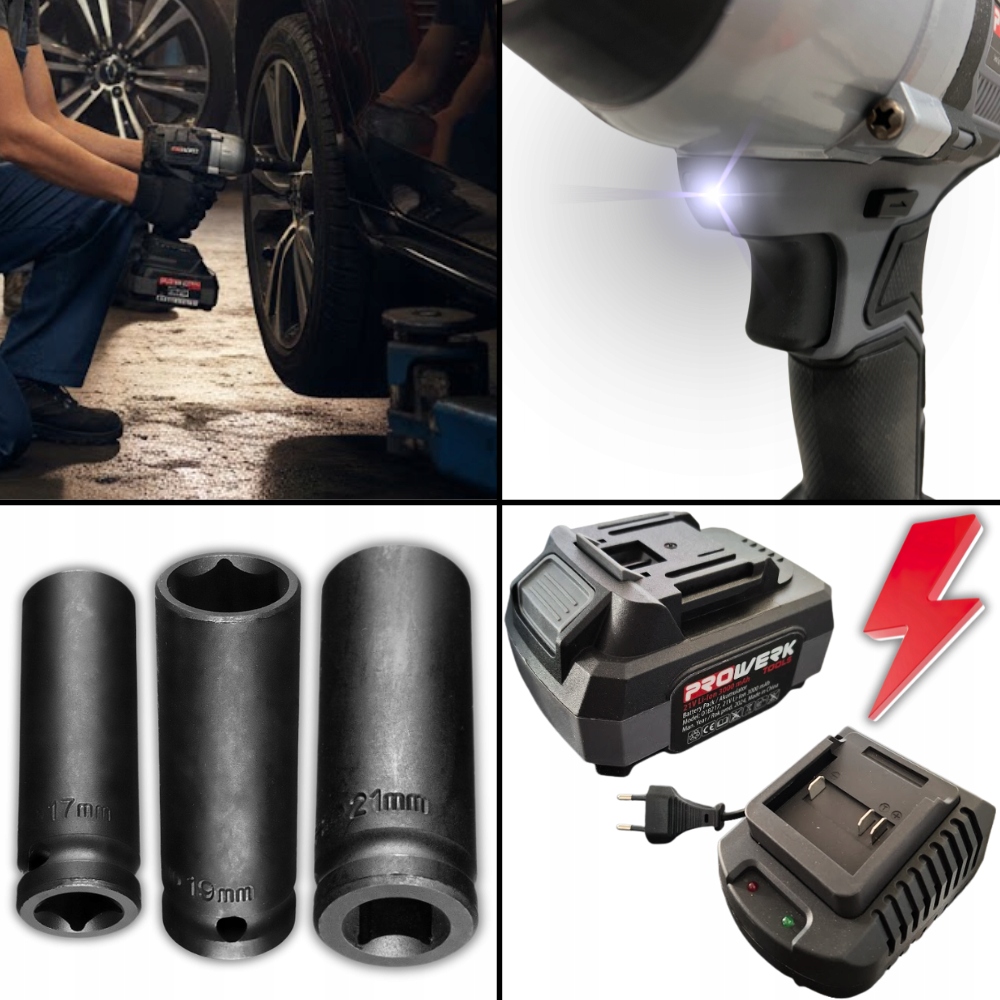 KLUCZ UDAROWY AKUMULATOROWY DO KÓŁ BEZSZCZOTKOWY MOCNY 3xNASADKI AKU ZESTAW 21V