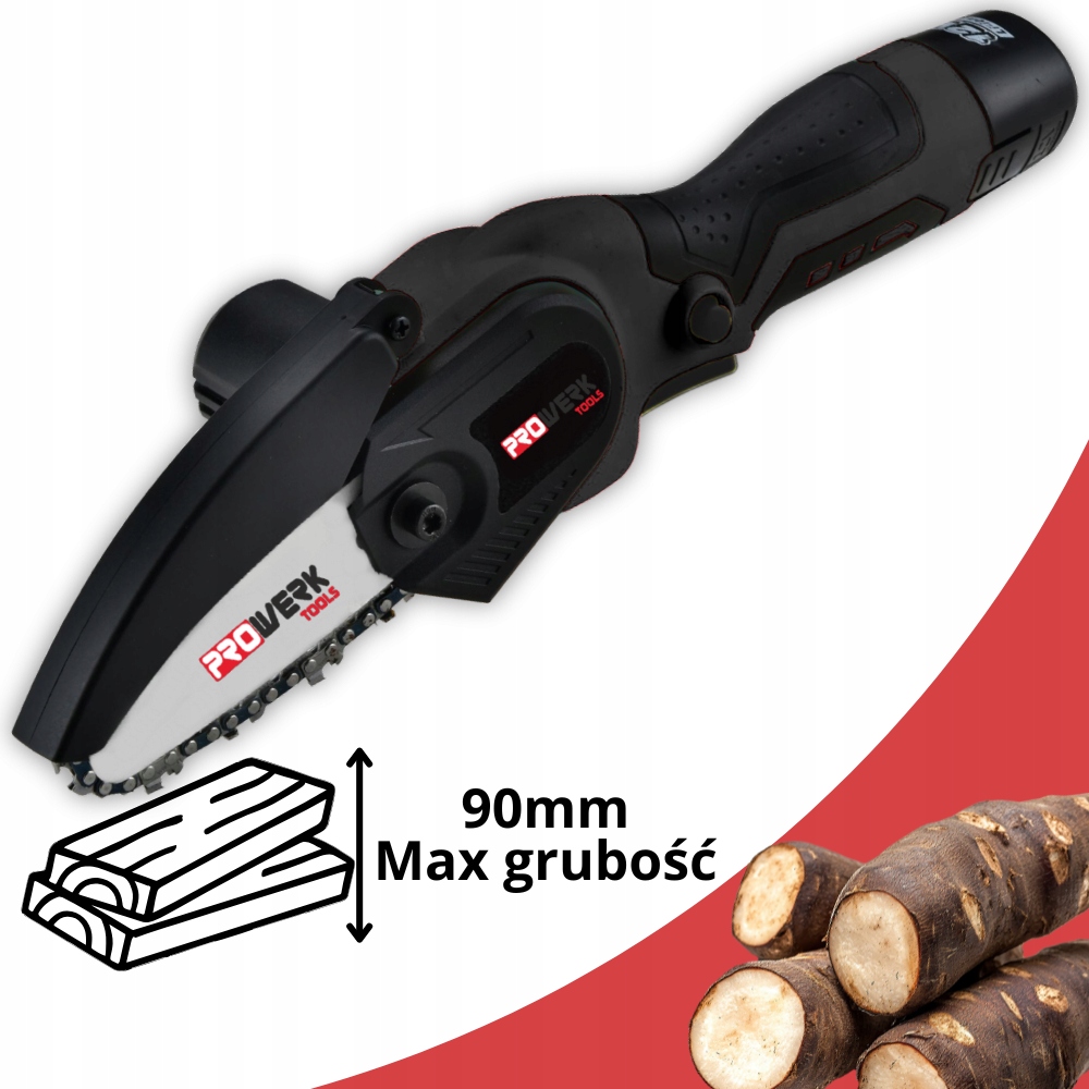- Akumulatorowa mini piła łańcuchowa 12V z zamontowaną prowadnicą 4" i łańcuchem.