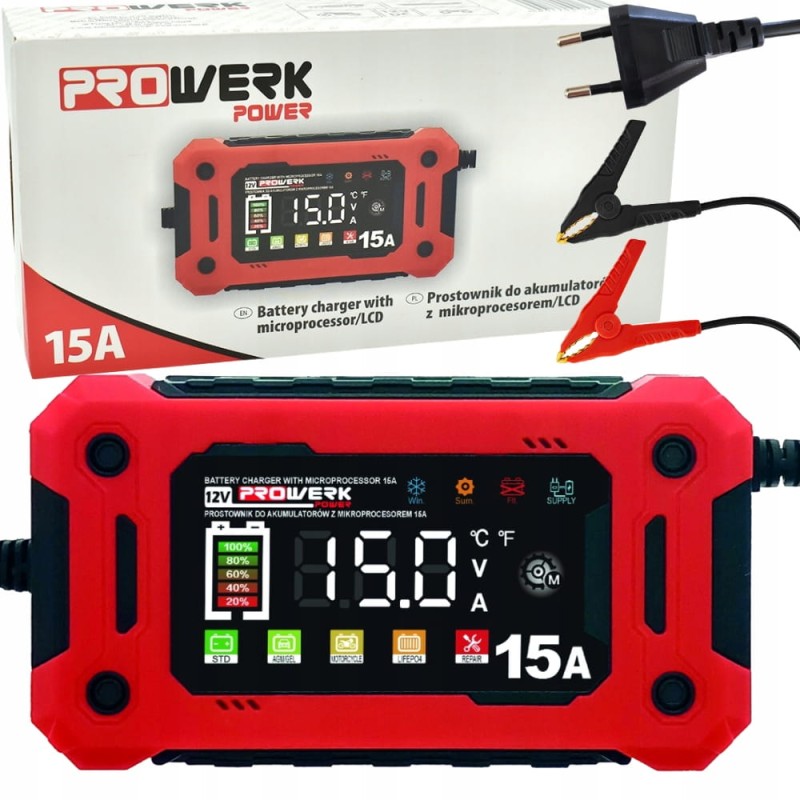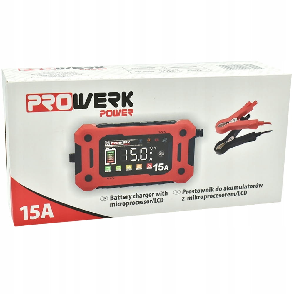 Prostownik Prowerk 15A powstał z materiałów i elementów o wysokiej jakości, dzięki czemu działa niezawodnie i zapewnia maksymalne bezpieczeństwo podczas ładowania akumulatora.
