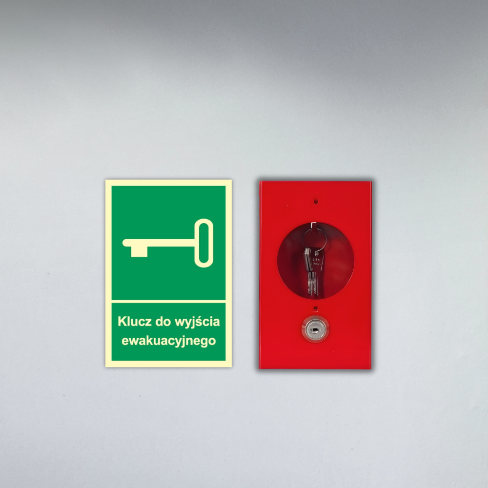 Skrzynka metalowa na klucz ewakuacyjny z zamkiem i kluczykiem z systemem "zbij szybkę" + Znak ochrony PPOŻ Klucz do wyjścia ewakuacyjnego 10x15 cm płyta PCV