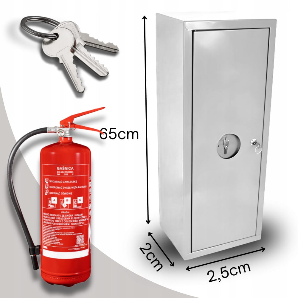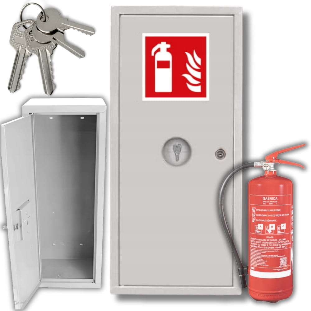- Uniwersalność: Szafka idealnie mieści gaśnice proszkowe, płynowe i pianowe o pojemności 6kg, 6L, 4kg oraz 2kg.