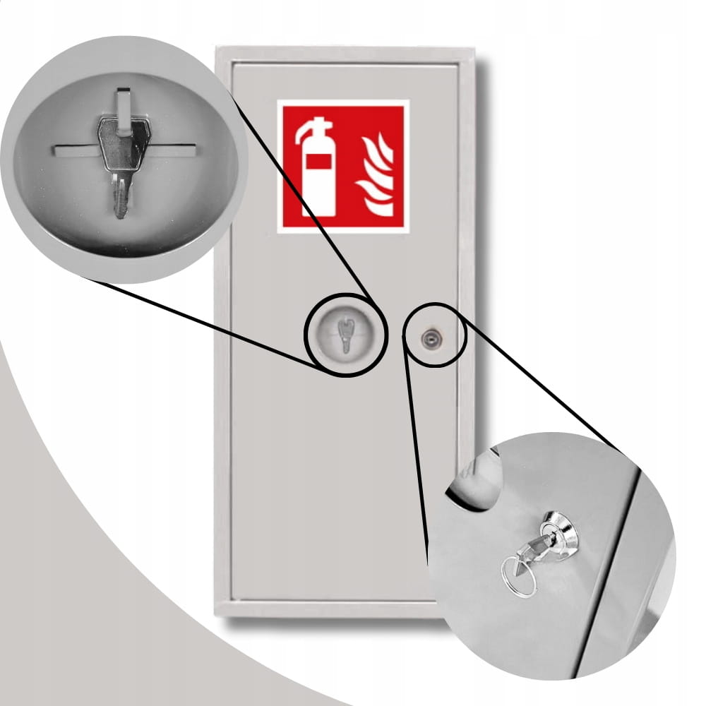 Szafka posiada zamek patentowy, który chroni gaśnicę przed osobami niepowołanymi. W sytuacji zagrożenia wystarczy zbić małą szybkę, wyjąć kluczyk i natychmiast przystąpić do akcji gaśniczej. To rozwiązanie sprawdzone i zgodne z przepisami BHP.