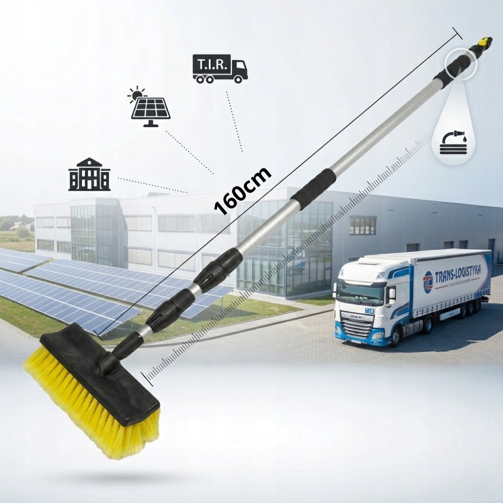 2️⃣Regulowany kij teleskopowy do 160 cm: Wykonany z lekkiego, ale niezwykle trwałego aluminium. Pozwala na płynną regulację długości, dzięki czemu bez problemu umyjesz dach vana, kabinę ciężarówki czy panele fotowoltaiczne na niższym dachu, sięgając nawet do 3-3.5 metra roboczego (wliczając wzrost użytkownika).