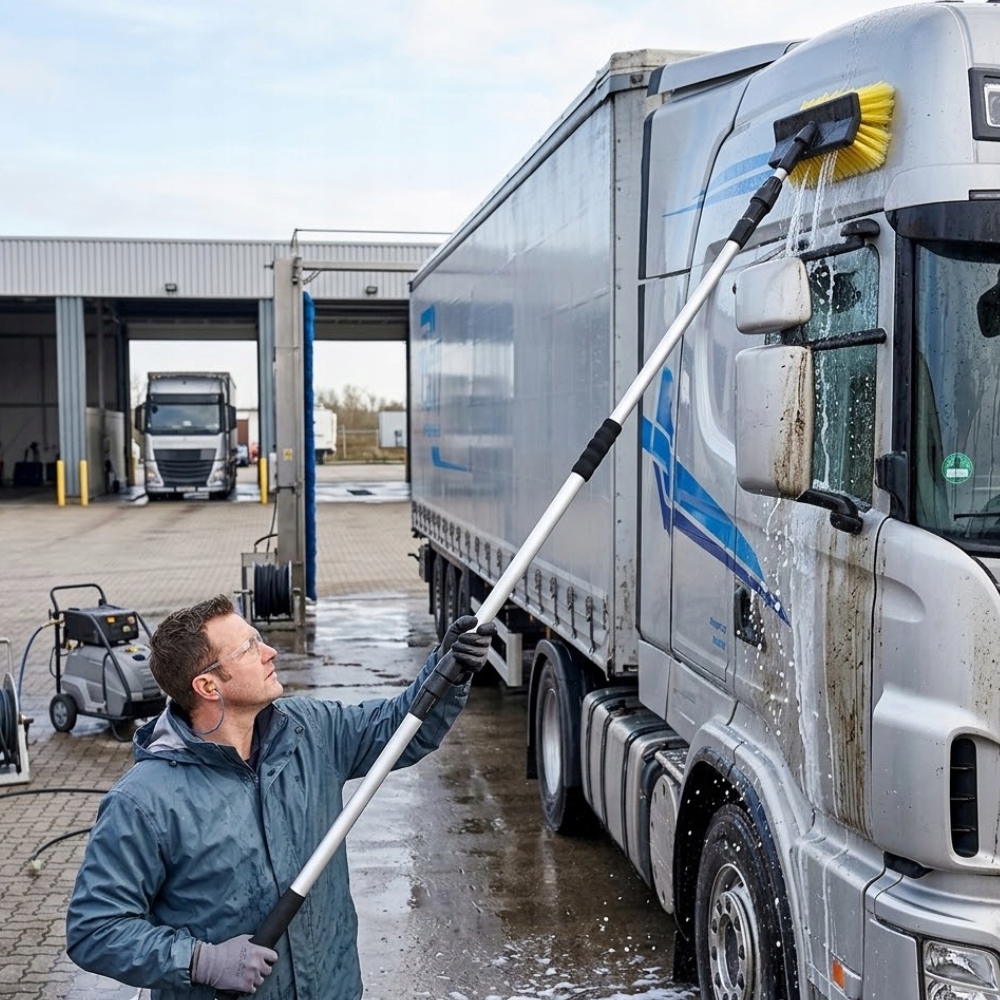 - Mycie samochodów ciężarowych, autobusów i busów: Długi zasięg i szeroka głowica aż 25 cm pozwalają szybko uporać się z brudnymi plandekami i wysokimi kabinami.