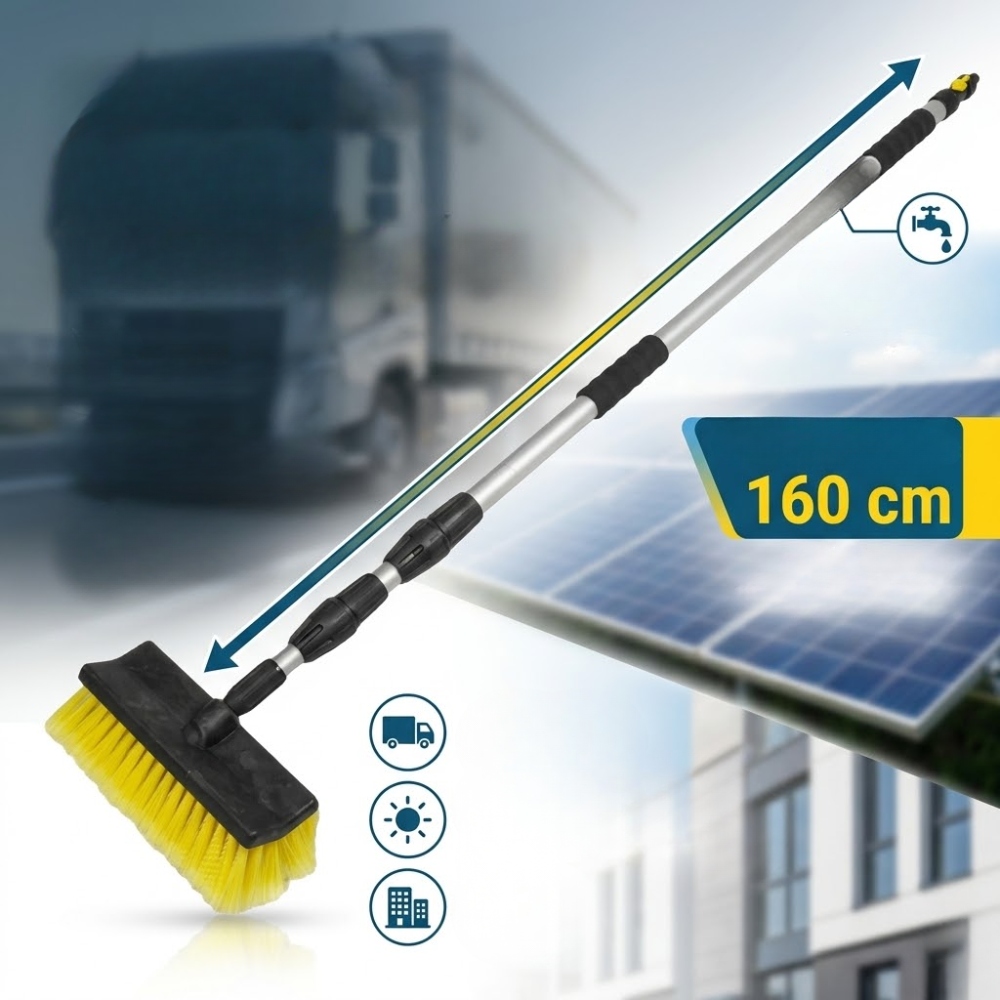 ➡️ Szukasz niezawodnego i wielofunkcyjnego rozwiązania do czyszczenia dużych i trudnodostępnych powierzchni? Szczotka teleskopowa do mycia z przepływem wody 160cm 3D to absolutny "must-have" w arsenale każdego kierowcy, właściciela domu z fotowoltaiką oraz profesjonalnej firmy sprzątającej. Dzięki innowacyjnej, dwustronnej budowie głowicy 3D oraz możliwości podłączenia bieżącej wody, nawet najbardziej uporczywe zabrudzenia znikają w mgnieniu oka.