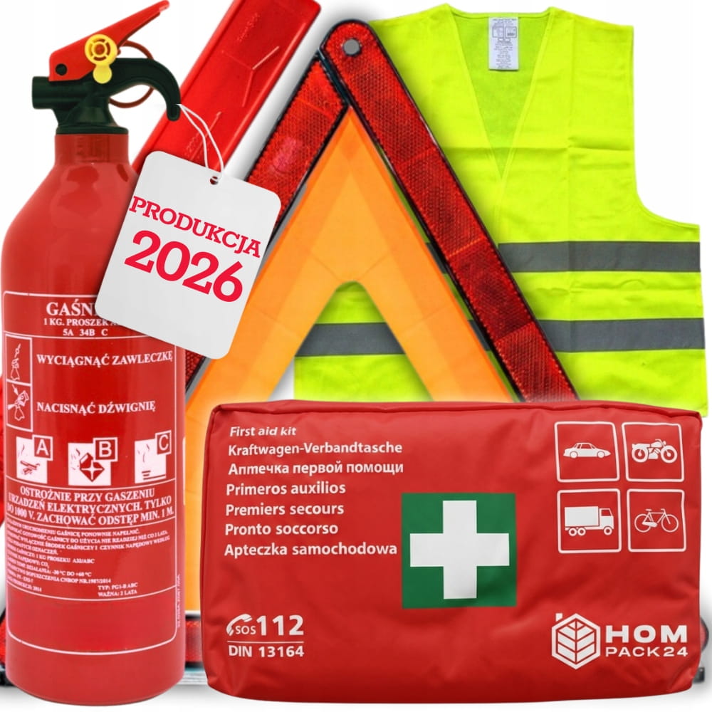 ✅ ZESTAW BEZPIECZEŃSTWA DO AUTA APTECZKA DIN13164 GAŚNICA SAMOCHODOWA 1KG 2026r. TRÓJKĄT OSTRZEGAWCZY KAMIZELKA ODBLASKOWA