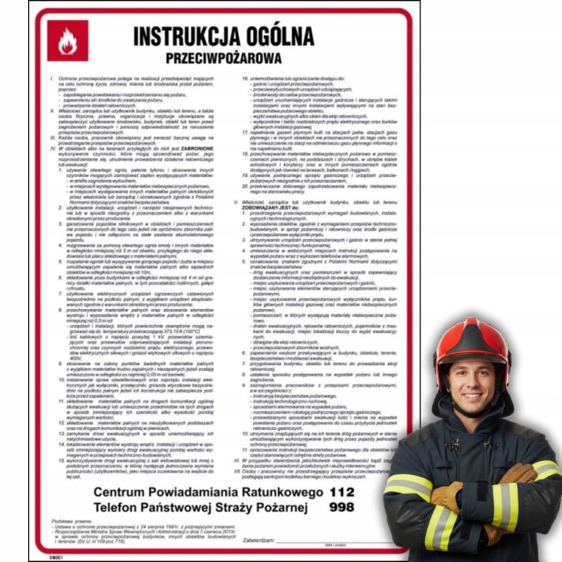 Opracowana zgodnie z obowiązującymi przepisami – Dz.U. z 1991 r. Nr 81 poz. 351, Dz.U. z 2020 r. poz. 961 z późn. zm. oraz rozporządzeniem MSWiA z dnia 7 czerwca 2010 r., instrukcja zawiera wszystkie niezbędne informacje dotyczące zasad postępowania w przypadku pożaru.