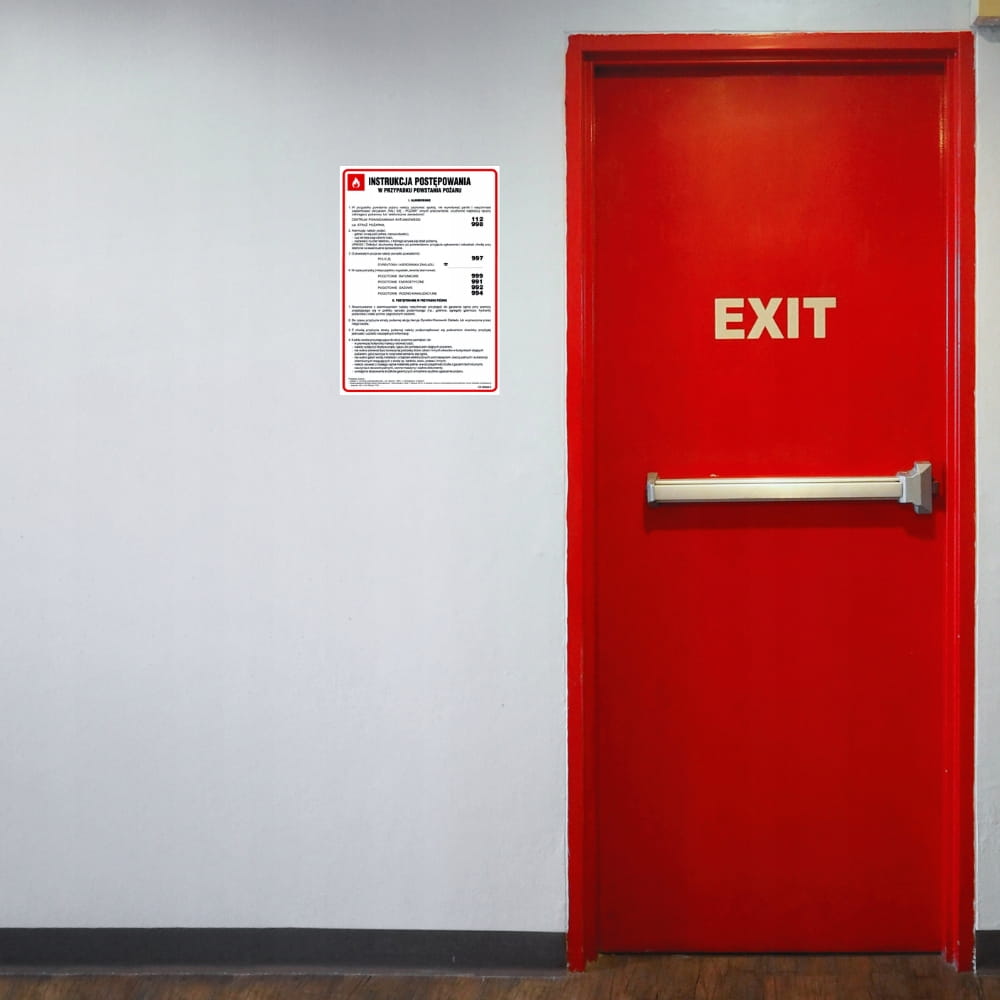 Instrukcja przeciwpożarowa w formie planszy została wykonana z elastycznej płyty HIPS o grubości 0,5 mm, która cechuje się wysoką odpornością na wilgoć, zarysowania i temperaturę. Plansza ma wymiar 24,5 x 35 cm i wyposażona jest w dwustronną taśmę samoprzylepną, dzięki czemu można ją łatwo zamocować na ścianie – wystarczy czysta, sucha i odtłuszczona powierzchnia. Estetyczne wykonanie i wyraźny druk sprawiają, że tablica doskonale sprawdzi się w każdym obiekcie biurowym, przemysłowym, szkolnym lub użyteczności publicznej.