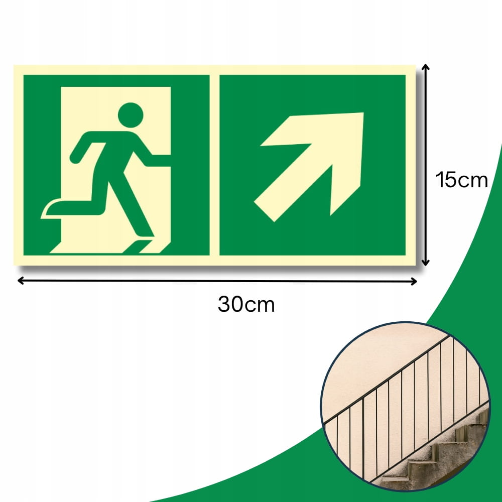Znak ochrony PPOŻ Wyjście Ewakuacyjne Prawostronne ze strzałką w Prawo w Górę 15x30 cm PN-EN ISO 7010 płyta PCV fotoluminescencyjna