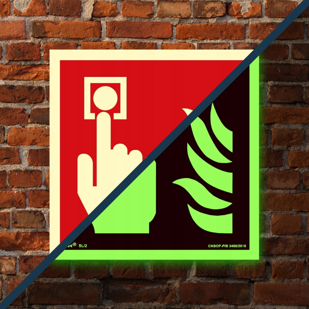 Znak ochrony PPOŻ Alarm Pożarowy 15x15 cm PN-EN ISO 7010:2012 płyta PCV fotoluminescencyjna certyfikat CNBOP